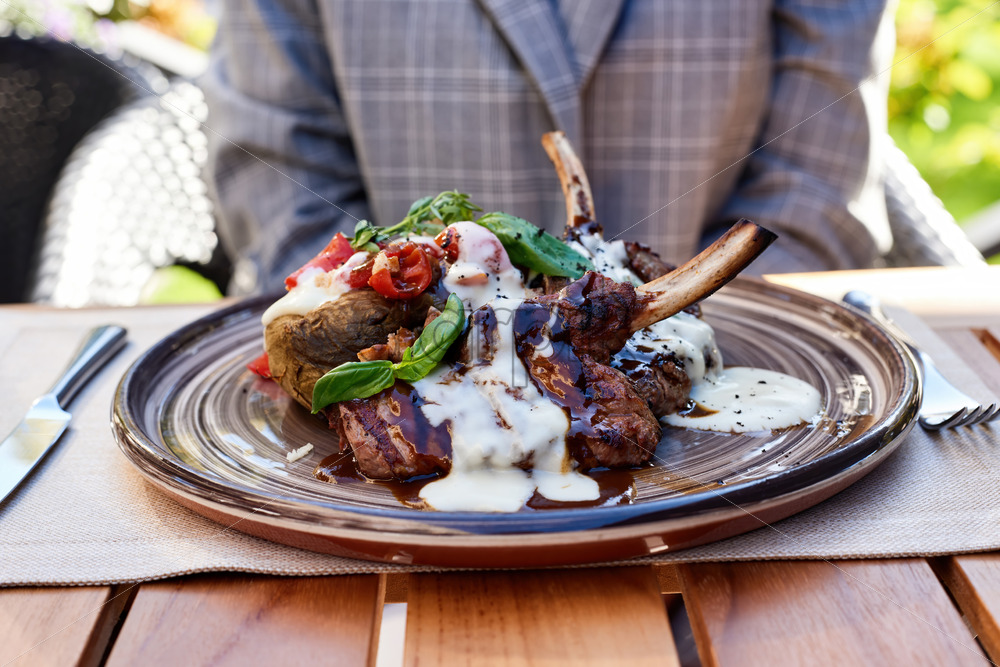 Meal in a restaurant, steak and salad, Chisinau, Moldova