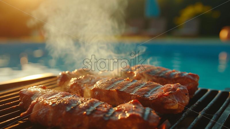 A poolside barbecue party with sizzling grills, delicious aromas, and casual summer vibes