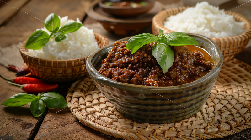 Rendang, a sumptuous Indonesian dish boasting tender chunks of meat simmered in a coconut-infused spice blend.