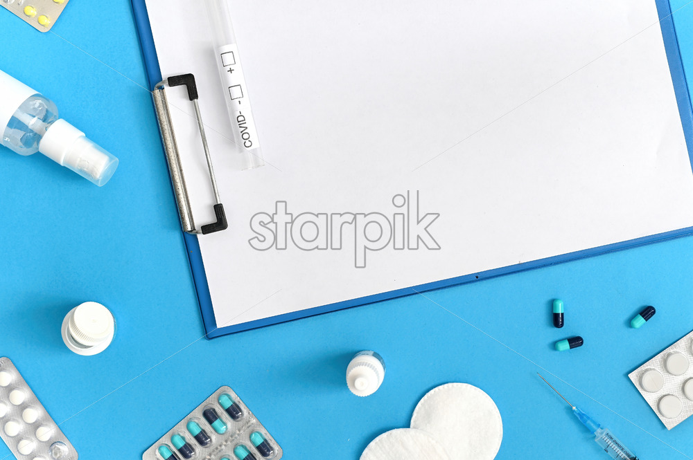 Medical supplies, notepad and covid test composition on blue background. Top view
