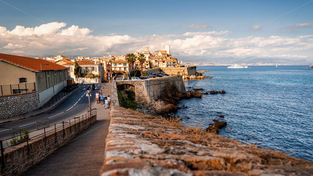 ANTIBES, FRANCE – AUGUST 30, 2021: Mediterranean sea coast at sunset. Embankment street with walking people, buildings