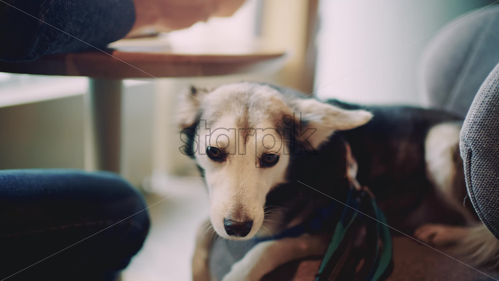 Medium sized dog lying calmly on a chair indoors while people sit nearby at a table