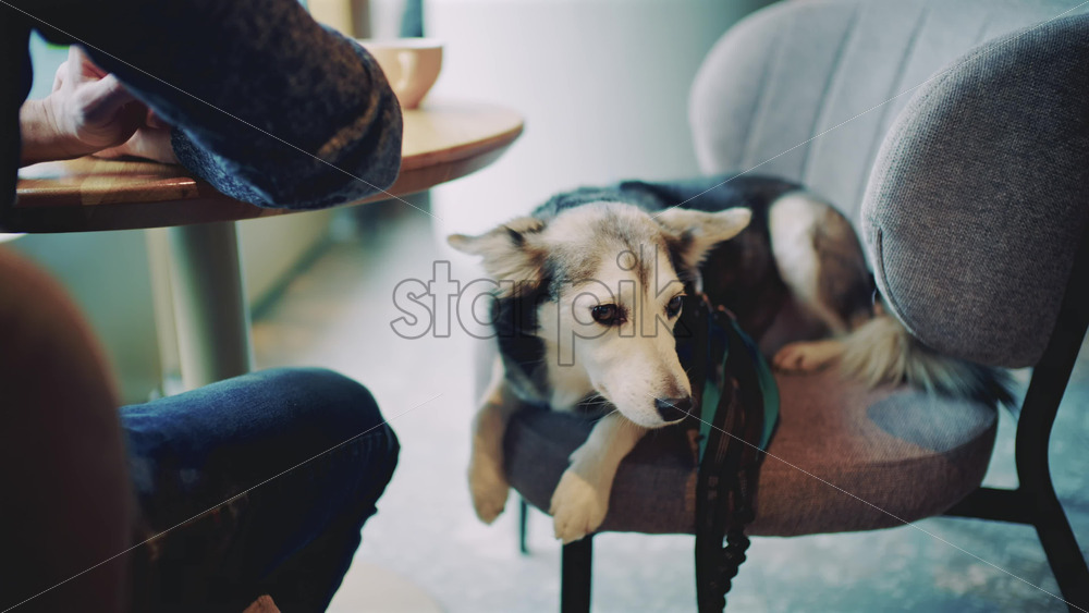 Medium sized dog lying calmly on a chair indoors while people sit nearby at a table