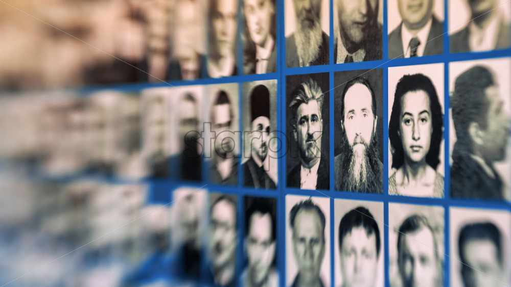 SIGHETU MARMATIEI, ROMANIA – OCTOBER 29, 2021: Memorial to the victims of communism and resistance, wall with people portrets. Lensbaby effect