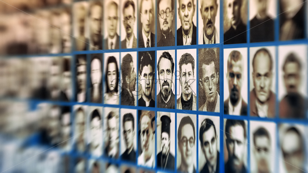 SIGHETU MARMATIEI, ROMANIA – OCTOBER 29, 2021: Memorial to the victims of communism and resistance, wall with people portrets. Lensbaby effect