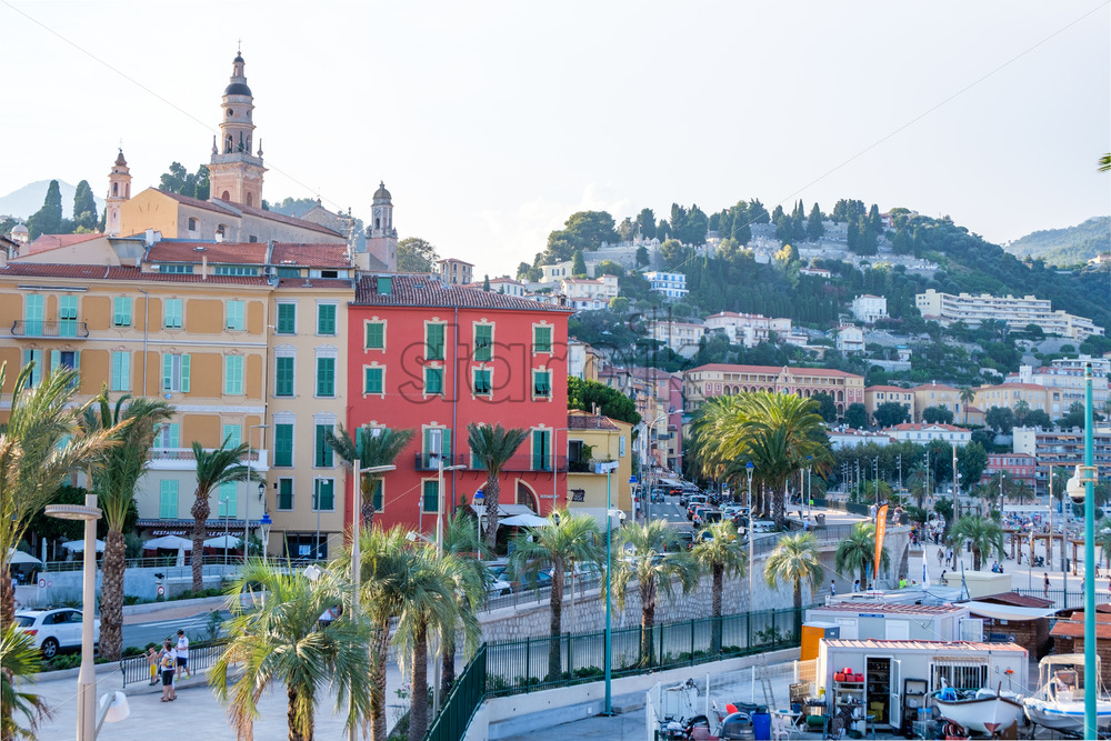 MENTON, FRANCE – AUGUST 06, 2018: City at sunset with cars riding on road. Colorful buildings and mountains Royalty Free Stock photo