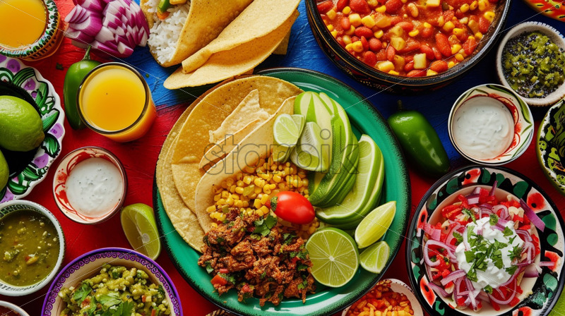 A captivating photograph showcasing the dynamic and lively essence of Mexican cuisine, featuring folded or rolled tortillas filled with an array of proteins and toppings. The tacos are artfully arranged on a colorful plate with sides like guacamole and salsa, … Read More