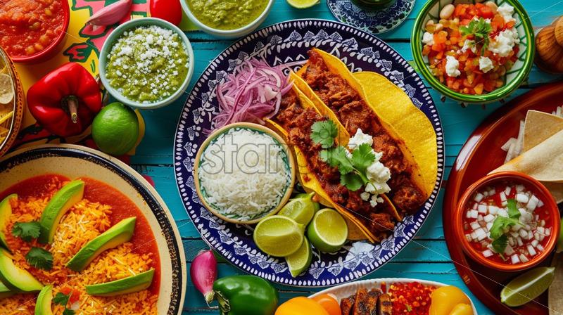 A lively photograph capturing the dynamic nature of Mexican cuisine, showcasing folded or rolled tortillas filled with various proteins and toppings. The vibrant tacos are artfully arranged on a colorful plate, accompanied by sides like guacamole and salsa. The scene … Read More
