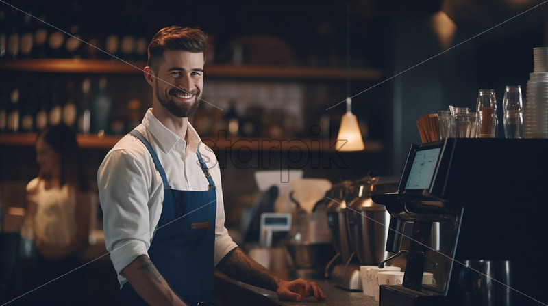 A barista meticulously preparing coffee amidst a cozy café ambiance with rustic mugs.