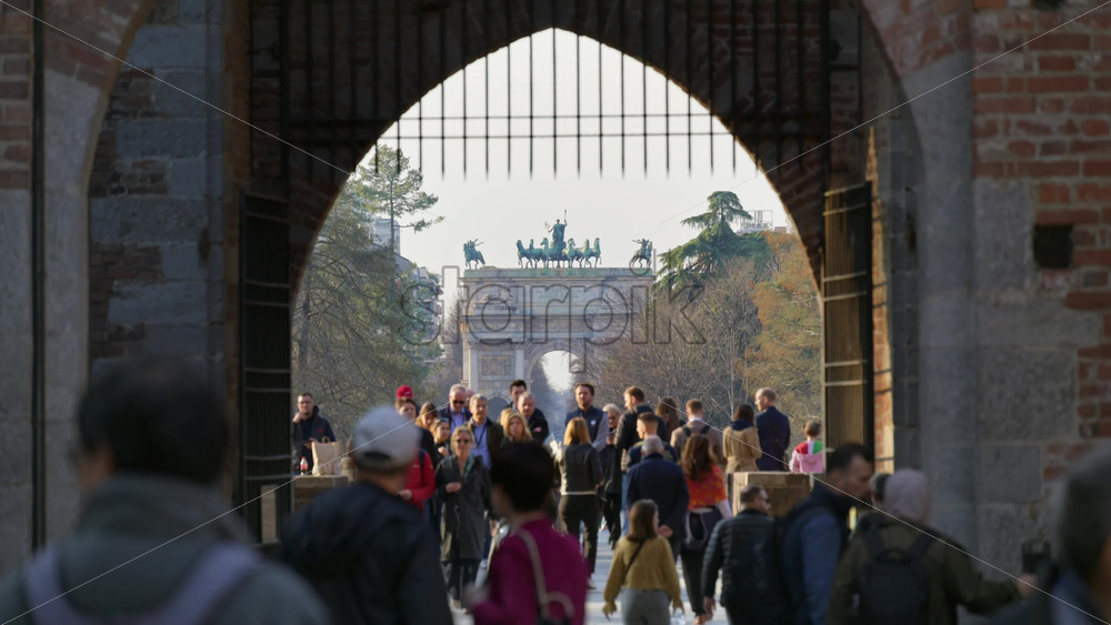 Milan, Italy – March 20, 2025: Multiple people entering and exiting the Sforzesco Castle in daylight with the Peace Arch in the background Royalty Free Stock Video Footage