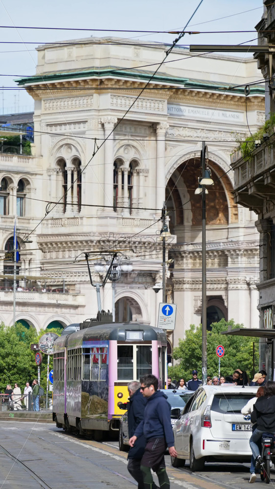 Milan, Italy – March 21, 2025: People and public transportation moving on the streets of the city in daylight. Vertical Royalty Free Stock Video Footage