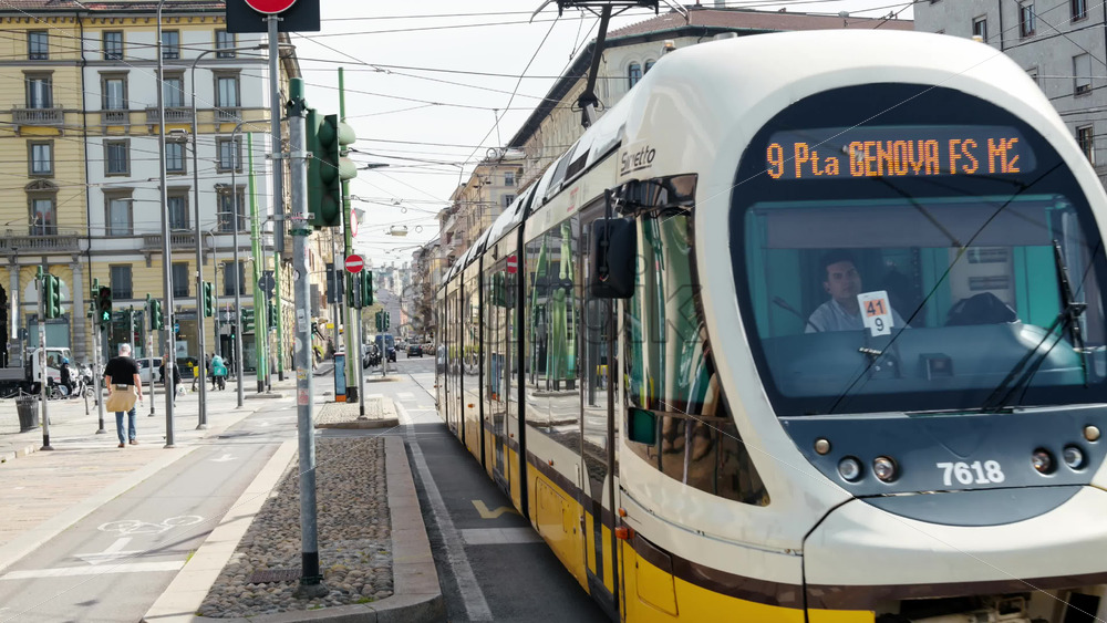 Milan, Italy – March 21, 2025: Tram moving on the streets of the city in daylight. Vertical Royalty Free Stock Video Footage