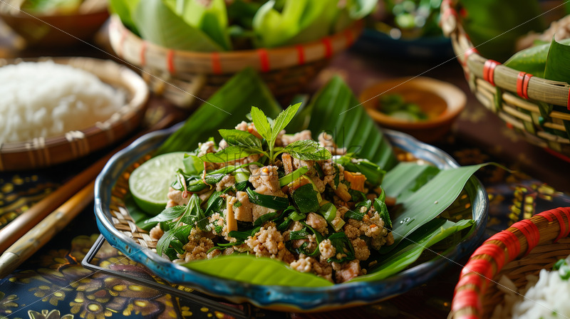Laotian Larb, a traditional minced meat salad seasoned with lime juice, fish sauce, herbs, and spices.