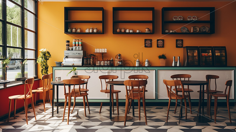Minimalist Cafe Architecture in the city clear wall glass in a yellow wall and white counter with wooden chair