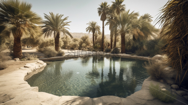Mirage-like oasis with palm trees and a shimmering pool in the arid desert