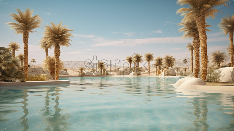 Mirage-like oasis with palm trees and a shimmering pool in the arid desert