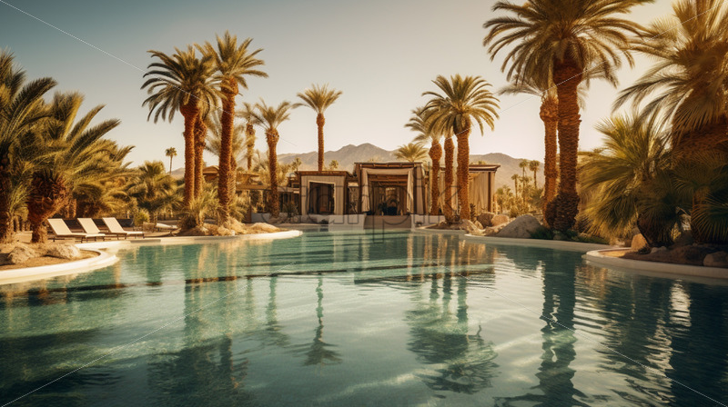 Home » Shop » Uncategorised » Mirage-like oasis with palm trees and a shimmering pool in the arid desert