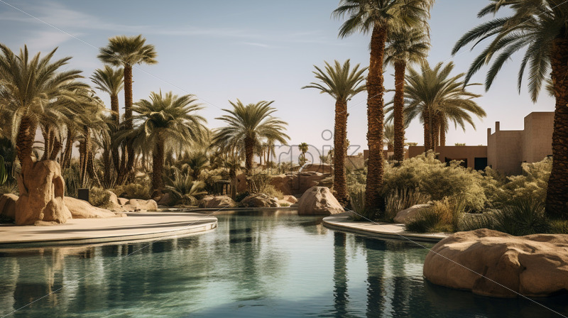 Mirage-like oasis with palm trees and a shimmering pool in the arid desert