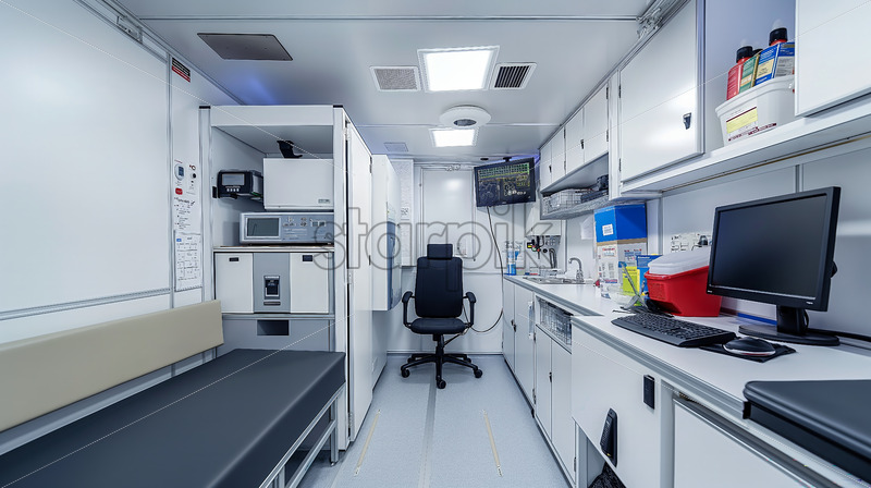 Fully equipped with medical tools, diagnostic equipment, telemedicine stations, and fold-out examination areas for efficient patient care.