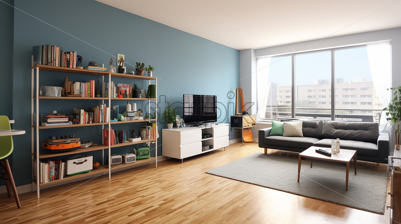 Modern apartment architecture in the city with clear glass window and a gray couch with bright ambience in a white and blue theme with book racks and tv in the lounge
