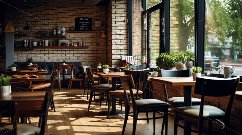 Modern Cafe in the city with clear glass wall and wooden tblle and a black chair with in indoor plants with a cinematic vibes