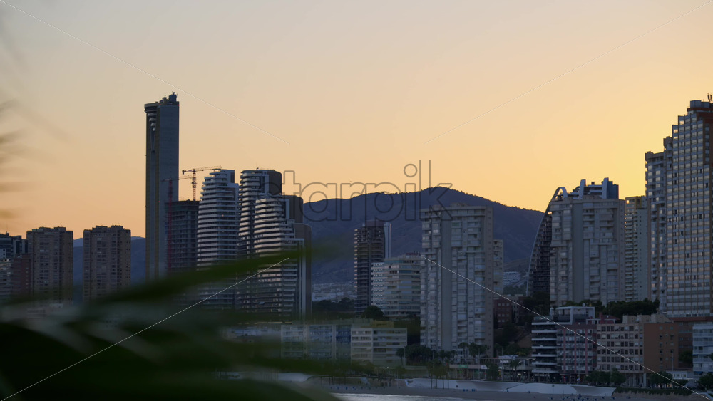 Benidorm, Spain – May 25, 2025: View across the water to Benidorm’s skyline in the evening Royalty Free Stock Video Footage