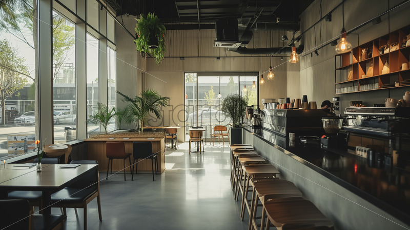 Early morning captures modern coffee shop, soft warm light, large windows, clean lines, wooden furniture, minimalist design.