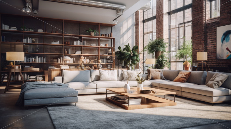 Modern house in the city , clear glass wall with classic couch and minimalist computer table , a cozy ambience
