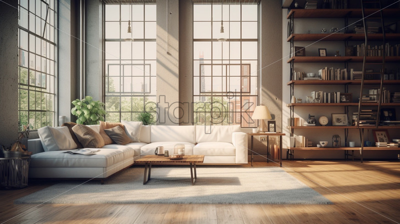 Modern house in the city , clear glass wall with classic couch and minimalist computer table , a cozy ambience