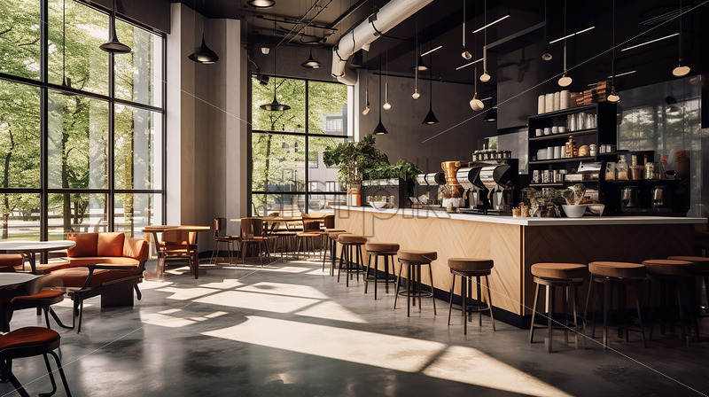 Home » Shop » Uncategorised » Modern Cozy Cafe architecture in the city with clear glass wall and wooden table and a black chair with indoor plants with a cinematic vibes