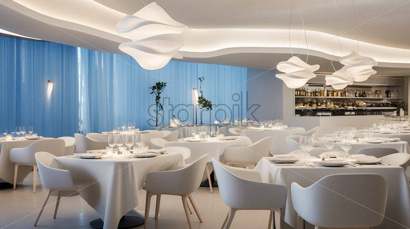 Modern cozy restaurant in the city in all white fine dining theme and a cozy vibes