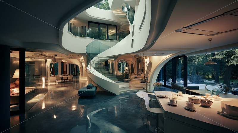 Modern elegant house in the city , clear glass wall on the and elegant dining with classy stair, an elegant ambience with white theme