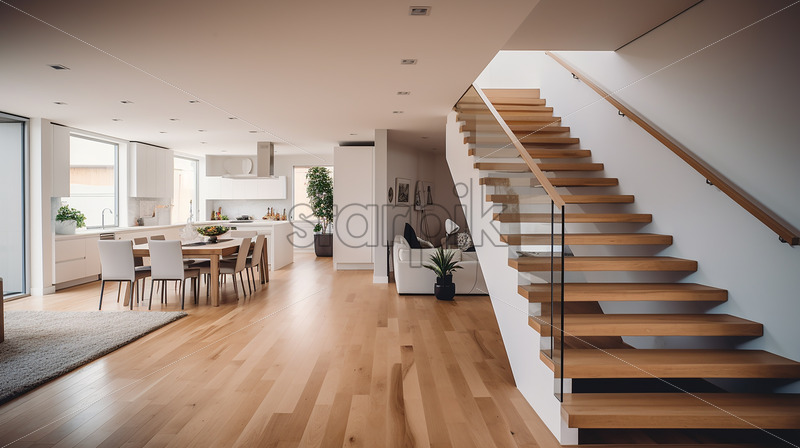 Modern elegant house in the city, minimalist dining, kitchen and classy stair, an elegant ambience with white theme and indoor plants