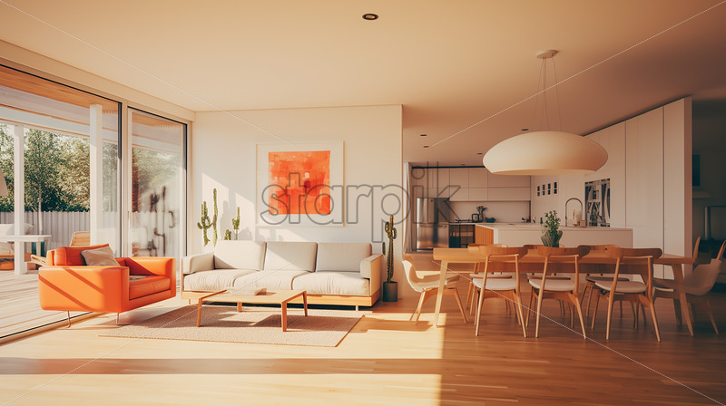 Home » Shop » Uncategorised » Modern elegant house in the city, wooden dining, kitchen and classy couch, an elegant ambience with white theme and indoor plants