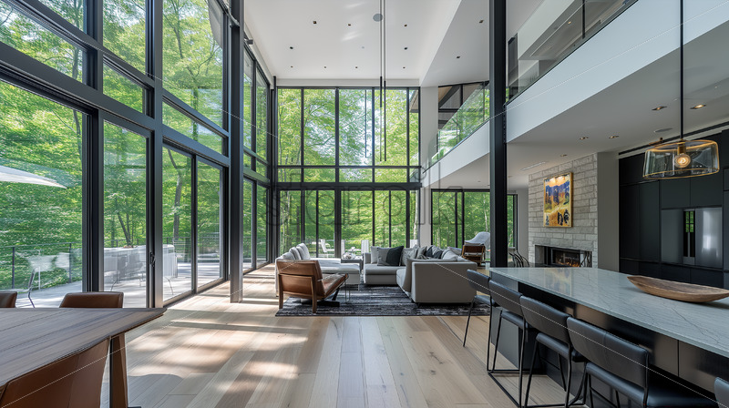 A contemporary house with floor-to-ceiling windows emphasizes high ceilings