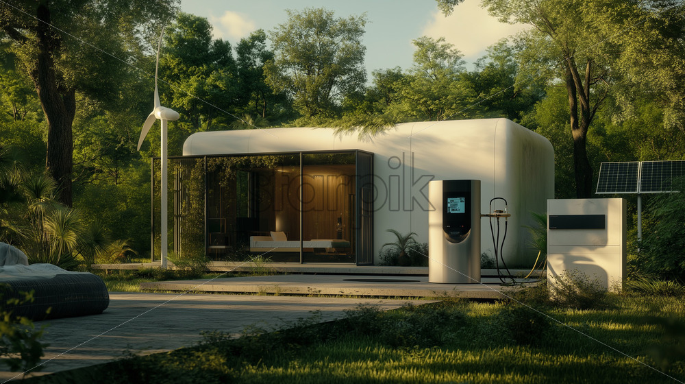 A futuristic eco-home surrounded by lush greenery, featuring solar panels, wind turbines