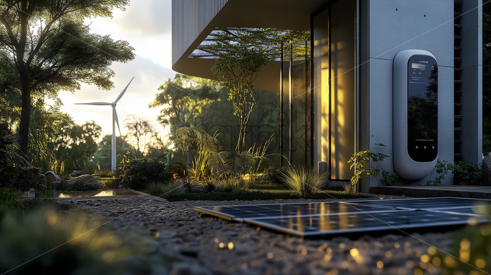 A futuristic green hydrogen plant powered by solar panels and wind turbines