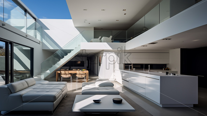 Modern house architecture in the city with clear glass wall and white ambience clear glass wooden stair and indoor plants