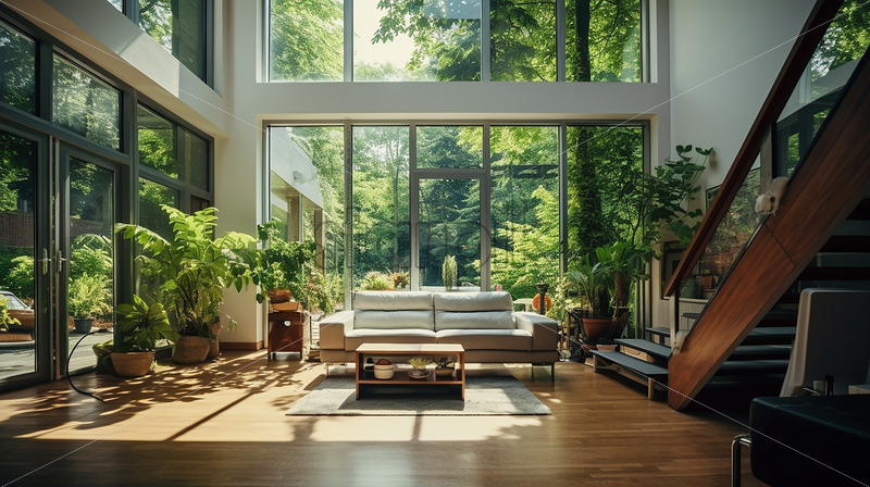 Modern house architecture in the city with clear glass wall in the lounge and a nature friendly home relaxing ambience cozy couch and wood stair and wood table