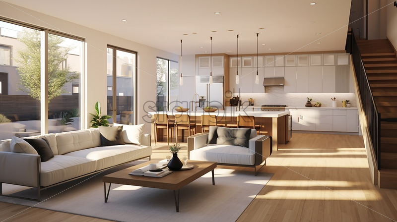 Modern house architecture in the city with clear glass wall in the lounge with kitchen and dining counter with bright ambience modern couch and small veranda