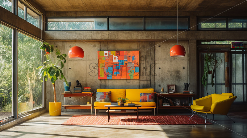 Modern house architecture in the country side with clear glass sliding door in the lounge with gray wall and orange chair with classic ambience