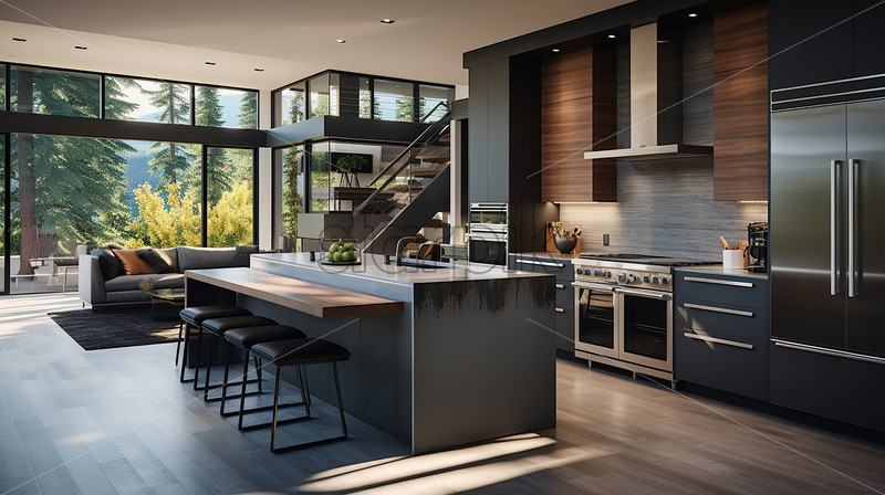 Modern house architecture in the country side with clear glass wall and dark gray ambience in a minimalist theme with a classy couch and dining counter in their kitchen