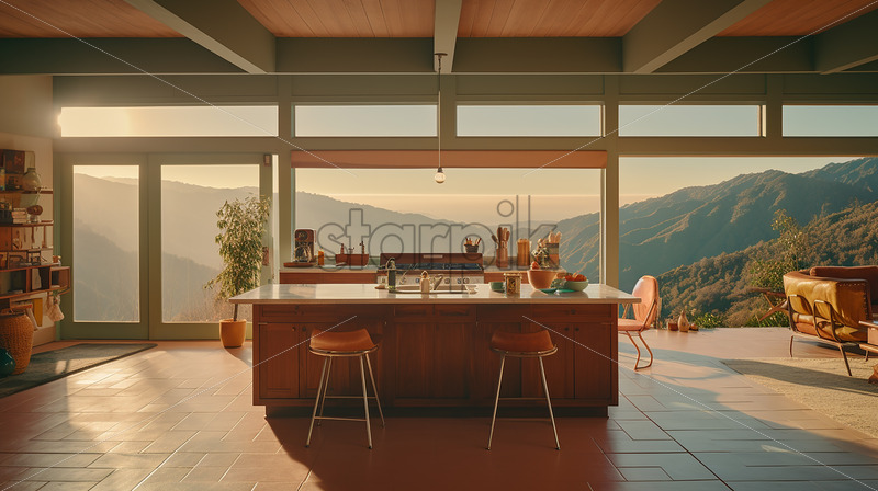 Modern house architecture in the country side with clear glass wall in front of the dining table and kitchen with brown ambience and indoor plants