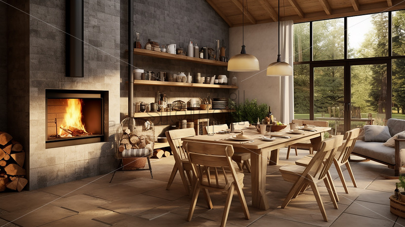 Modern house architecture in the country side with clear glass wall in front of the dining table and lounge with minimalist ambience and a firebox for winter gray and wood theme