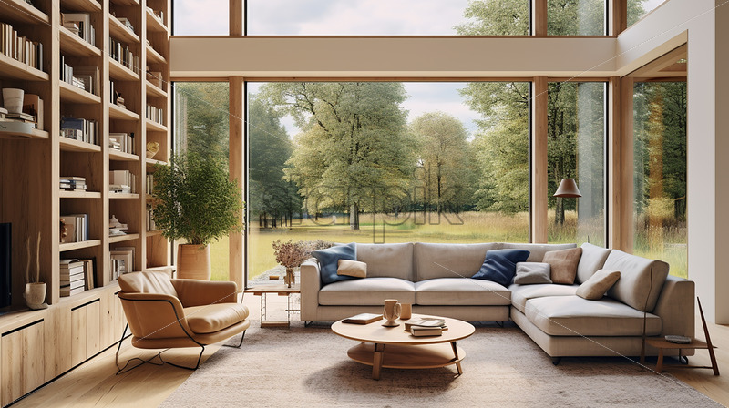 Modern house architecture in the country side with clear glass wall in the lounge and a book shelves bright ambience cozy couch and wood table and a fresh air backyard