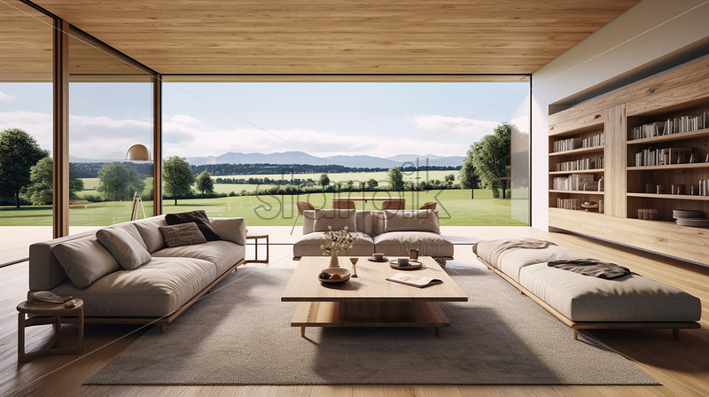 Home » Shop » Uncategorised » Modern house architecture in the country side with clear glass wall in the lounge and a book shelves with bright ambience cozy big couch and wood table and a fresh air backyard
