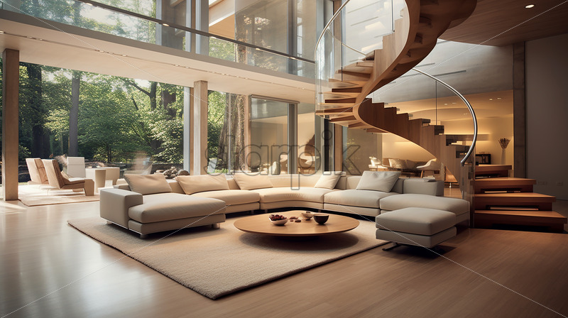 Modern house architecture in the country side with clear glass wall in the lounge with spiral wooden glass stair in a bright ambience modern big couch and veranda
