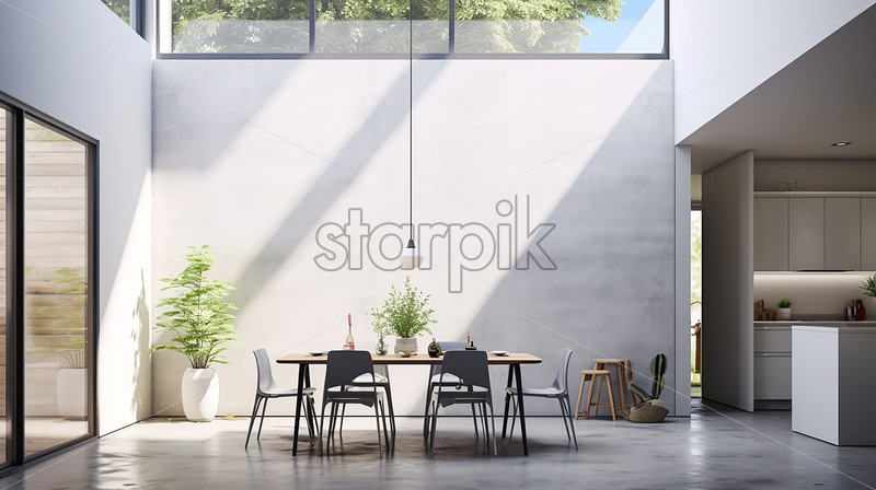 Modern house architecture in the country side with clear glass wall in the second flour and sliding door in the kitchen with gray dining table and white kitchen counter with minimalist ambience