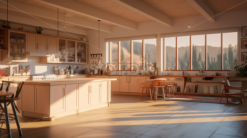 Modern house architecture in the country side with clear glass wall in the side of the dining table and kitchen with minimalist ambience