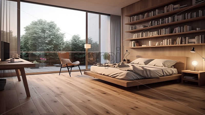 Modern house in the city a wooden bedroom with balcony, clear glass sliding door and a computer table
